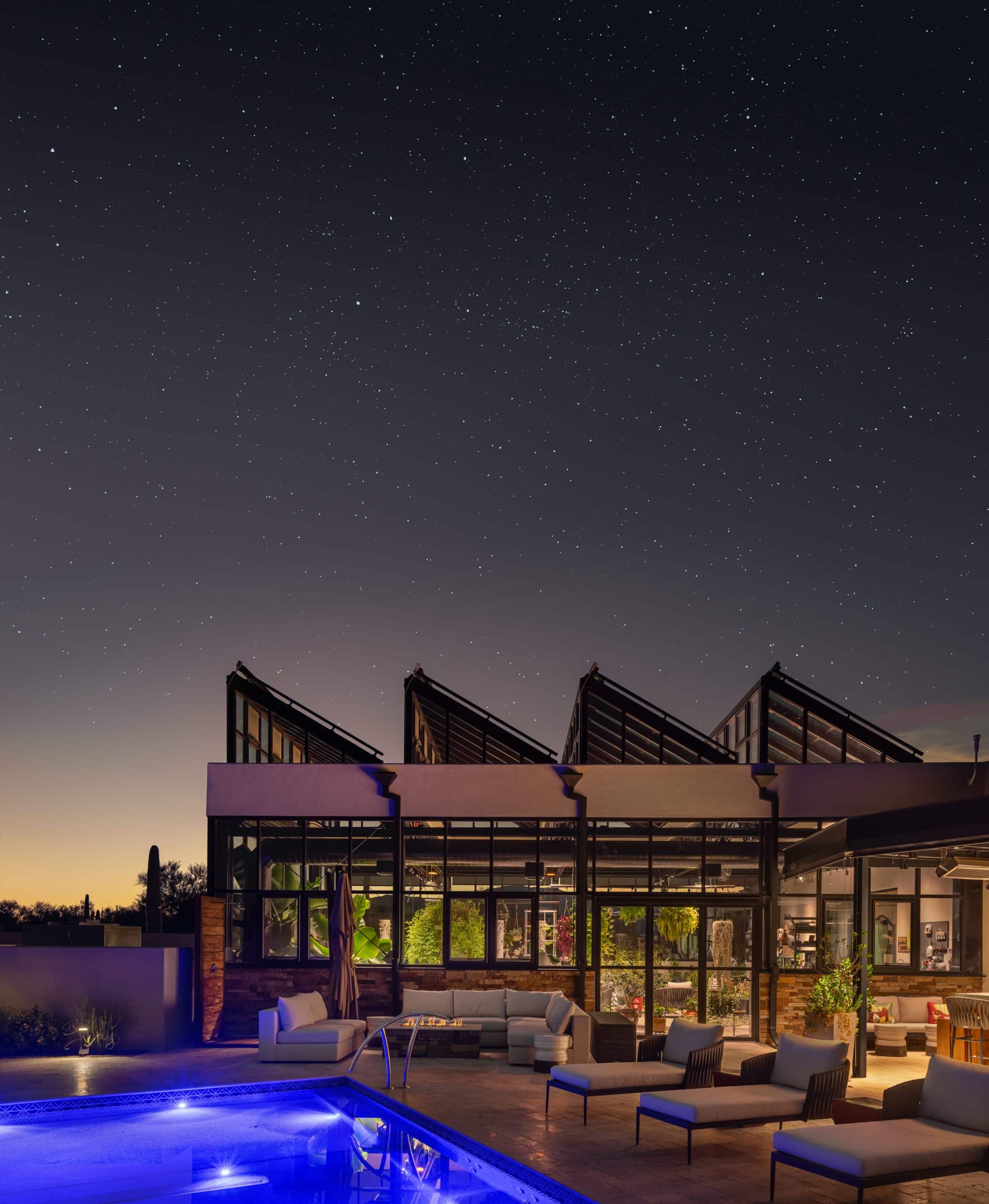 We engineered a custom roof system to manage the area’s monsoon seasons, designing four separate roof sections to shed large volumes of water quickly. The structure also had to comply with strict building codes limiting height and preventing light pollution, so we created a low-profile design that blends seamlessly with the surrounding desert.