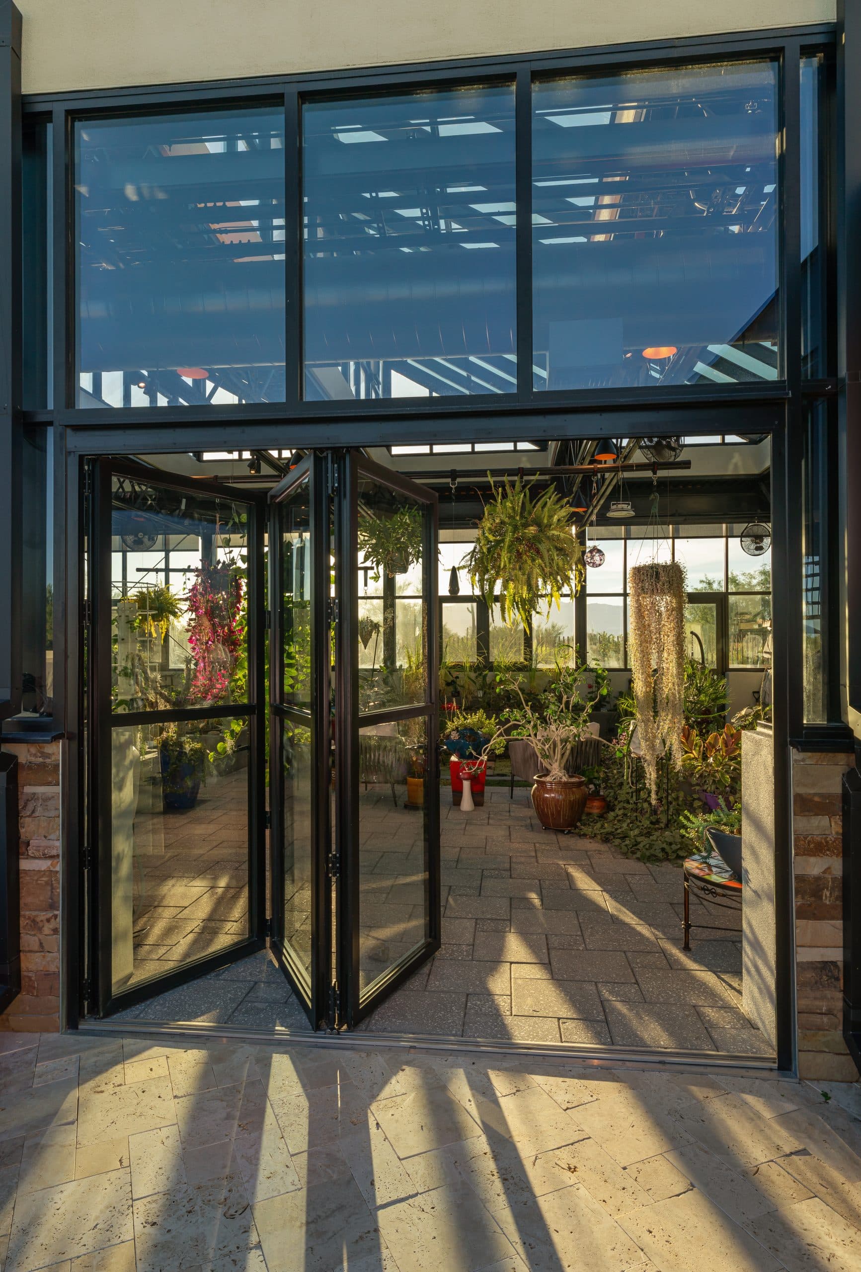 We also installed a large tri-folding glass door, allowing the greenhouse to open completely to the adjacent pool, patio, and outdoor kitchen. It connects the growing space directly to the client’s everyday living area.